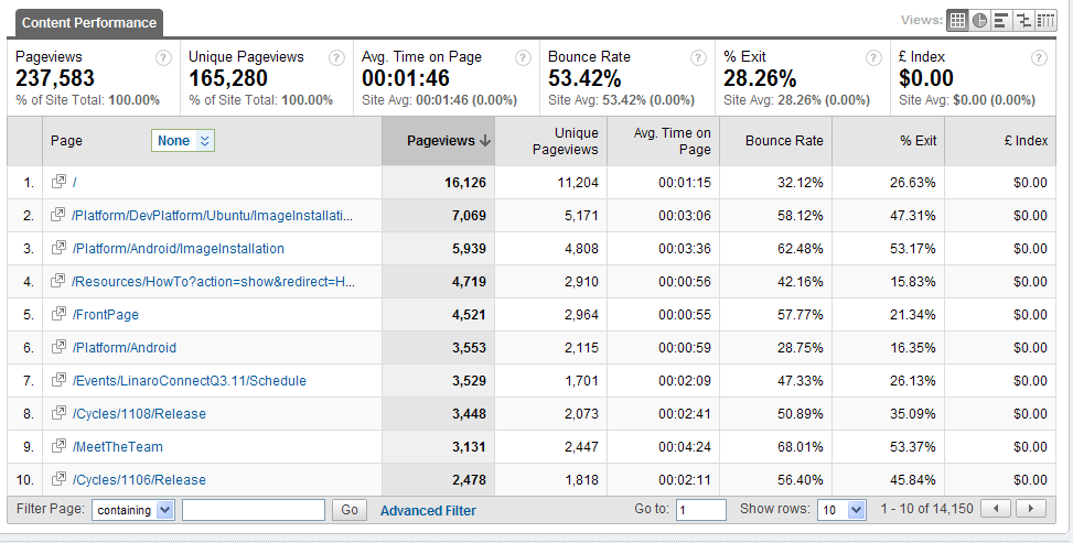 Android, Platform Image Installation, Meet The Team, Linaro Connect and the Monthly releases are what users are going to. We need to make sure they are all one click away and near the top of the page. (Also are there any other pages we would _like_ people going to that they don't currently? They could be candidates to elevate to the top)